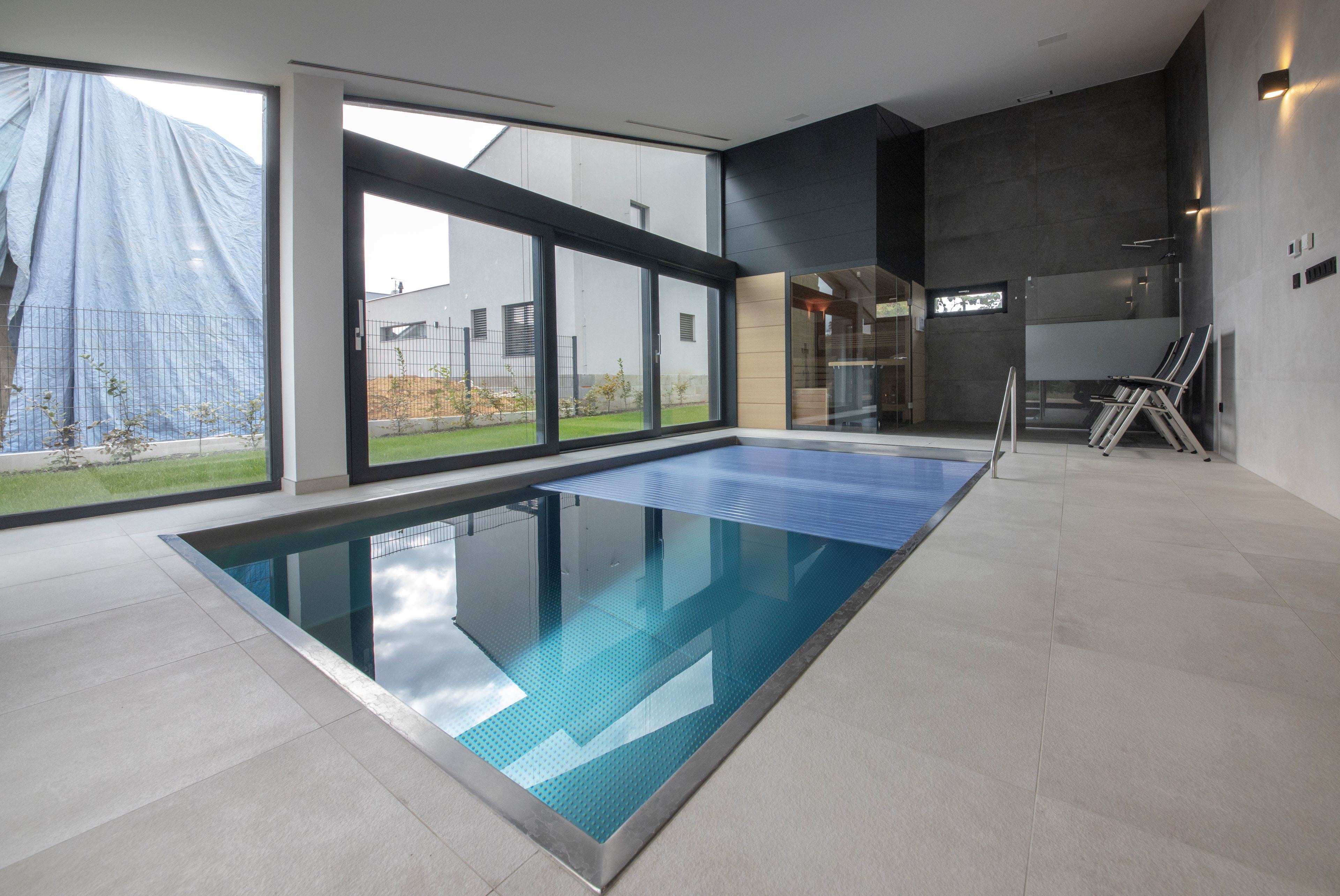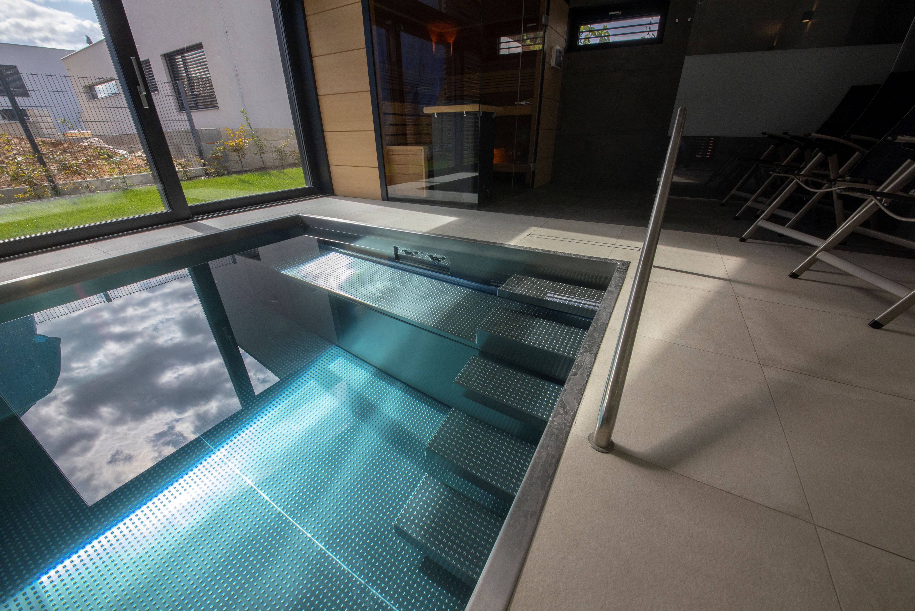 Ústřední atrakcí bazénové haly je skimmerový bazén z nerezové oceli o rozměrech 5 x 3 x 1,4 metru s přiznanou nerezovou hranou. Vzhledem k malým rozměrům bazénu se jej rozhodl zákazník vybavit výkonným protiproudem UWE Bambo 2, u kterého se nemusí ani v nejmenším bát, že by jej přeplaval.