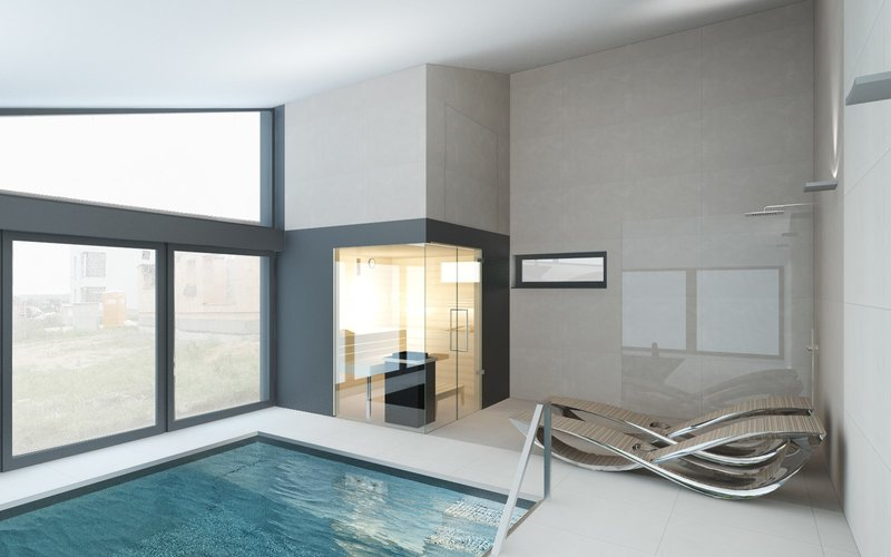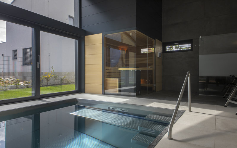 Moderní novostavba rodinného domu, velkorysé vzdušné prostory, vysoké stropy, celoprosklená stěna s výhledem ven, velké posuvné dveře a jednoduchý čistý styl pracující s různými odstíny šedé a béžové. Přesně do takovéto místnosti jsme instalovali naše dva prémiové produkty – finskou saunu Premium Klafs a nerezový bazén Imaginox. Samozřejmě nesmím zapomenout zmínit inteligentní ovládací systém celé domácnosti, díky kterému mají naši klienti nejen neustálý přehled, co se v domácnosti děje, ale také mohou na dálku ovládat spotřebiče v místnosti – stejně tak i saunu a bazén.
