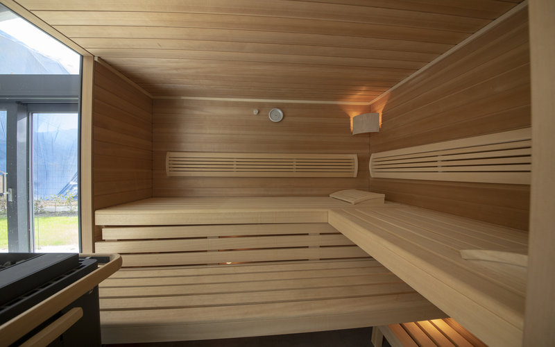Vnitřek saunové kabiny je obložen úzkými softlinovými panely ze smrku, zatímco pro lavice bylo použito jemné dřevo africké vrby. Lavice se nacházejí ve dvou výškových úrovních, kdy horní jsou široké 70 cm a spodní pouze 50 cm. Sauna je navíc vybavena podlavicovým osvětlením, rohovou lampou Luma a podlaha byla pokryta tmavou velkoformátovou dlažbu, které jsou použity i ve zbytku zadní části místnosti.