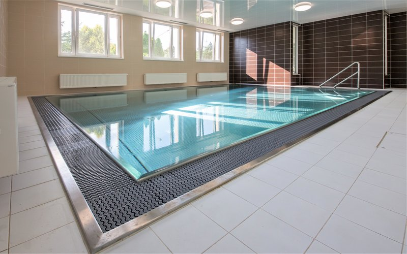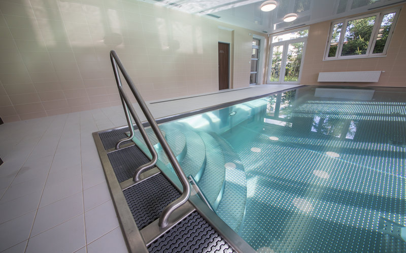 Právě z těchto důvodů se iniciátoři projektu rozhodli bazén umístit do interiéru a vybavit jej tepelným čerpadlem a UV lampou, které se starají o perfektní tepelné podmínky a dokonalou čistotu vody. Bazén o rozměrech 7,15 x 4,5 x 1,3 metru je dále vybaven lamelovým zakrytím s šachtou rolety zabudovanou ve dně bazénu, zaobleným rohovým schodištěm a dvěma světelnými reflektory.