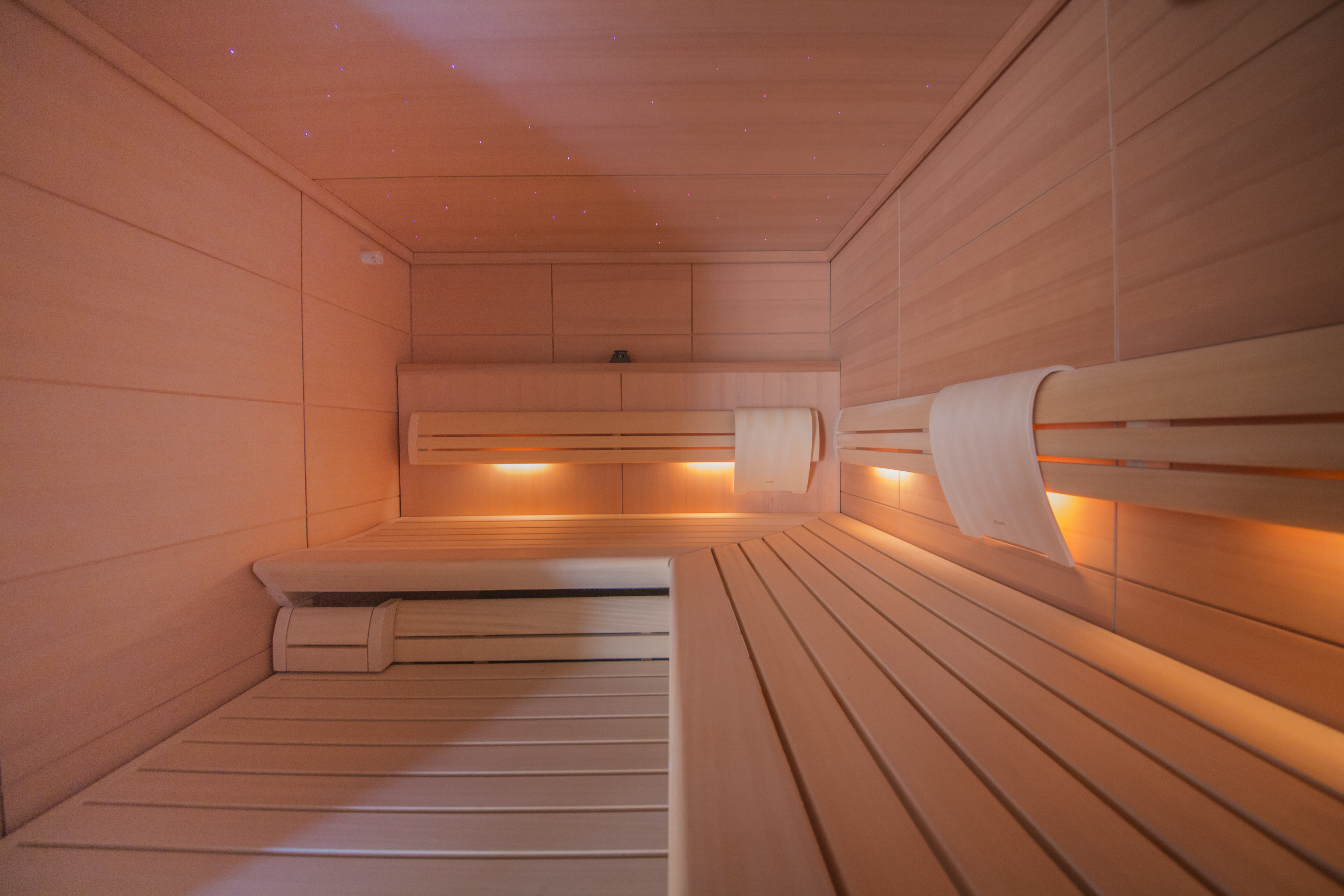 Uvnitř domu jsme instalovali prostornou saunu Lounge Q německého výrobce Klafs o rozměrech 216, 5 x 200 x 280 cm navrženou na míru tak, že skvěle využívá omezeného prostoru místnosti. Světlé interiérové obložení Hemlock jedlovce kanadského koresponduje s jemným nasvícením opěrek a jedinečným hvězdným nebem. Dále je sauna doplněna podlavicovými kamny Bonatherm, krycími panely mezi lavicemi a schůdkem usnadňující vstup na lavici.