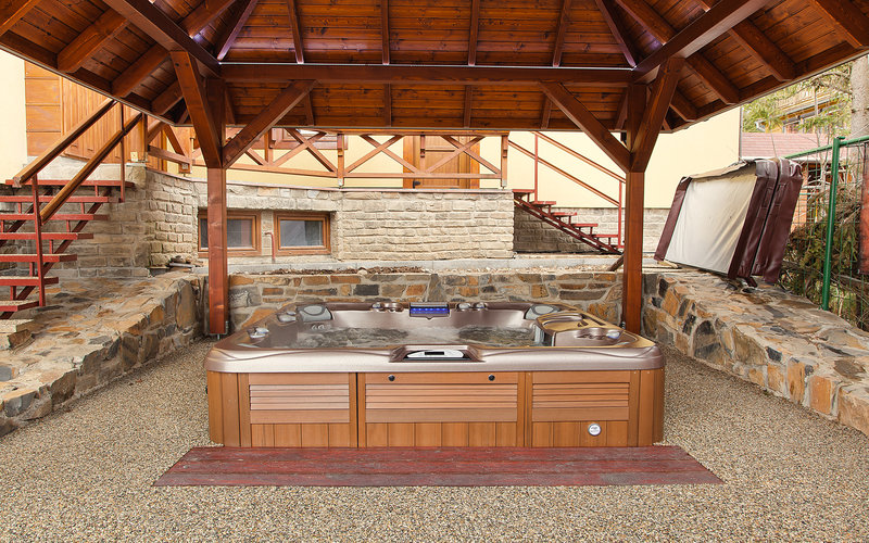 Vzhledem ke krásnému okolí jsme jednu z vířivek umístili na terasu zastřešenou dřevěným altánkem – a touto vířivkou je právě prostorný model Optima řady 880 SUNDANCE SPAS, který je se svými rozměry 226 x 226 x 95 cm vhodný pro užívání až 6 osob současně. Vířivá vana OPTIMA je vybavena 47 hydromasážními a 14 vzduchovými tryskami, vodopádem, horizontálním filtrem a vnitřním i vnějším osvětlením. V případě této vany zvolil klient barvu vnitřní skořepiny Oyster a u vnějšího obložení se rozhodl pro Teak.