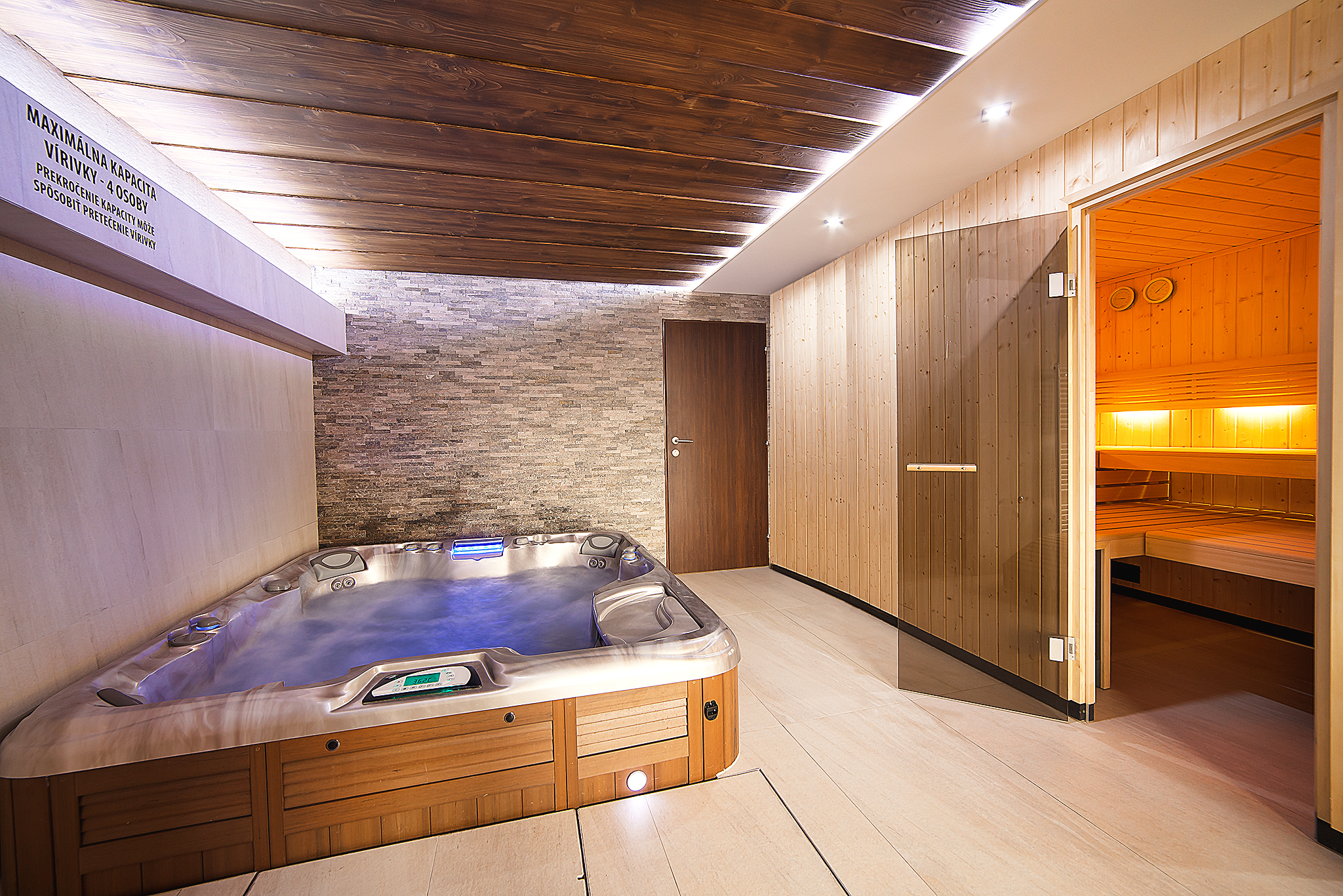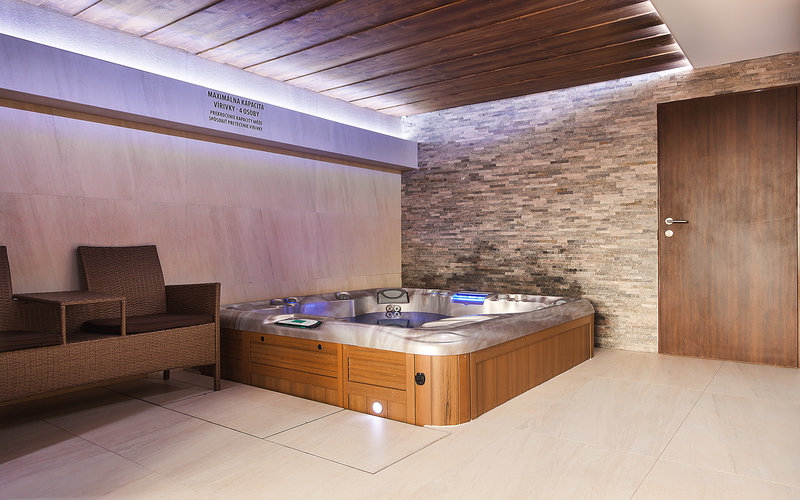 Druhou hydromasážní vanou, tentokrát ale umístěnou ve vnitřních prostorách penzionu, je model Majesta taktéž prémiové řady 880. Tato vířivka má rozměry 206 x 219 x 95 cm a je určena pro užívání až 5 osob zároveň. Vnitřní skořepinu vany si klient vybral v šedém žíhaném provedení Coppersand a pro vnější obložení zvolil světle hnědou teakovou barvu dřevoplastu, kdy stejně jako venkovní vířivka je i tato do poloviny zapuštěná – což je nejpohodlnější možné provedení pro vstup a výstup z vířivé vany.