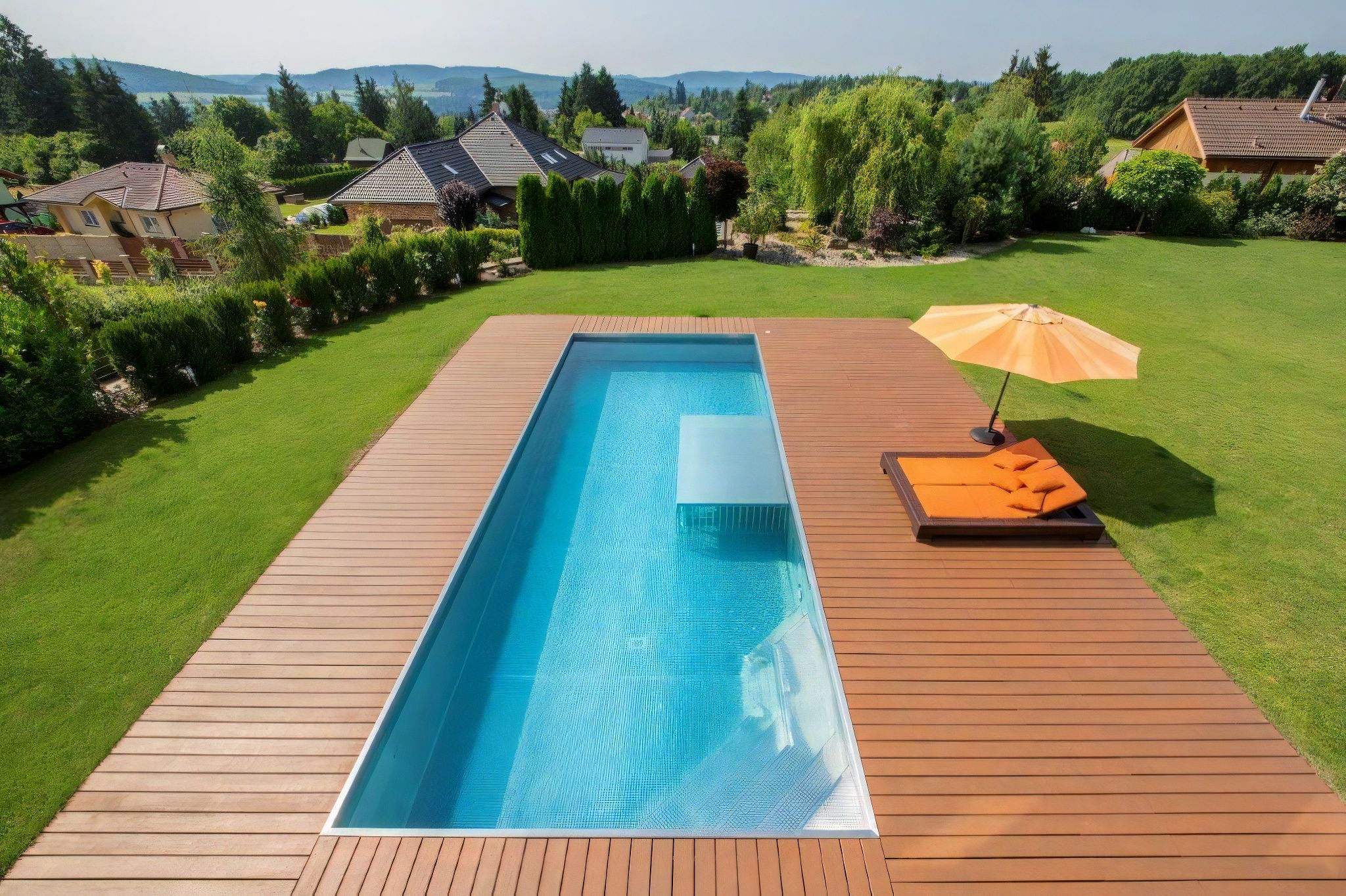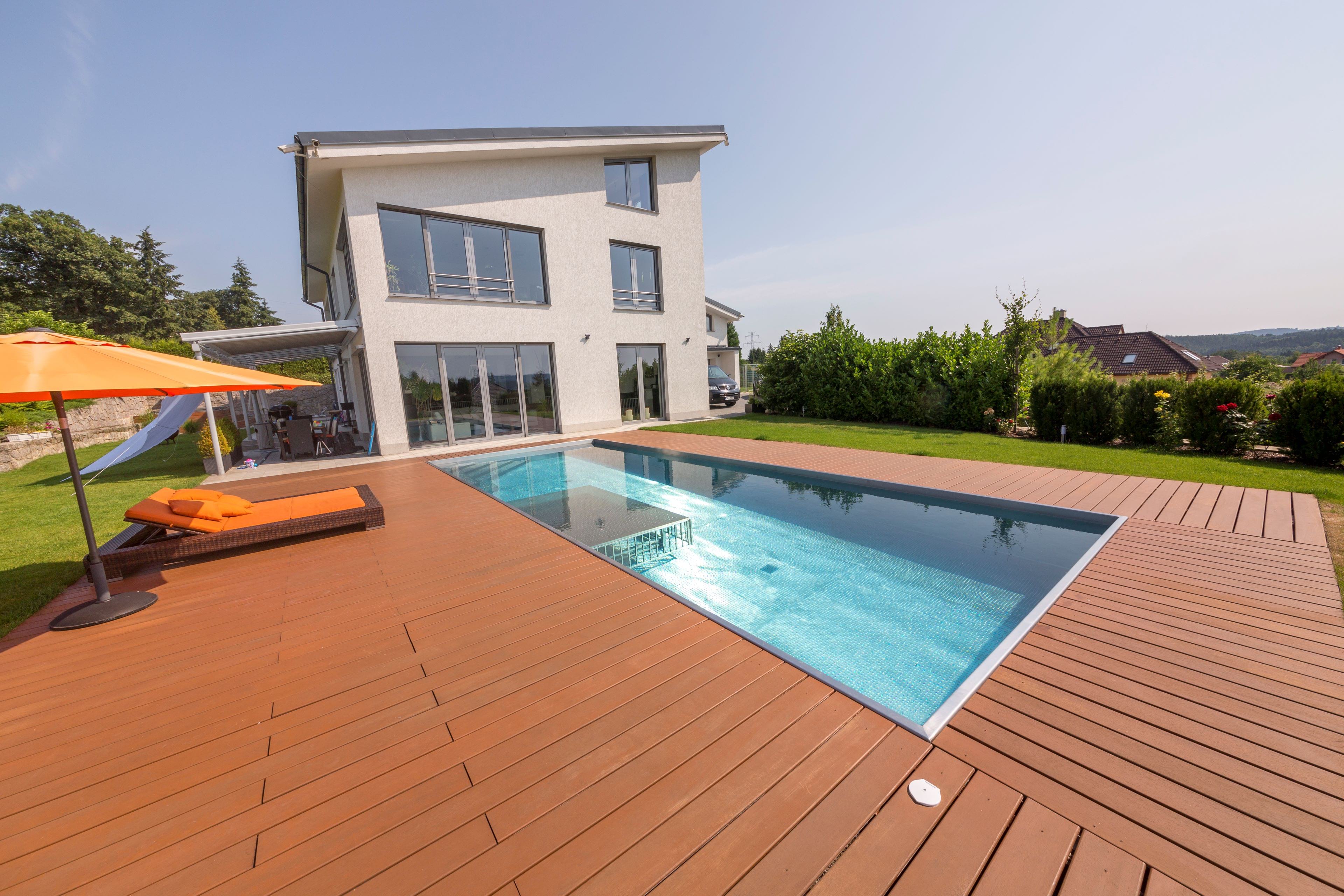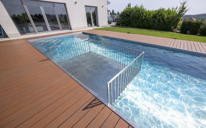 Venkovní bazén s rozměry 10 x 4 x 1,4 metru a přiznanou nerezovou hranou je umístěn na terase s dřevoplastovým obložením přímo před rodinným domem. Nerezový bazén je vybaven rozsáhlým rohovým schodištěm s plochou vhodnou k odpočinku, třemi podvodními reflektory, automatickým roletovým zakrytím zabudovaným ve stěně a v neposlední řadě také dvěma skimmery zabudovanými po dlouhé stěně. Mezi nimi se nachází bezpečnostní madlo, v jehož prostoru jsme vybudovali dětské brouzdaliště, které je výjimečné svým nastavitelným provedením.