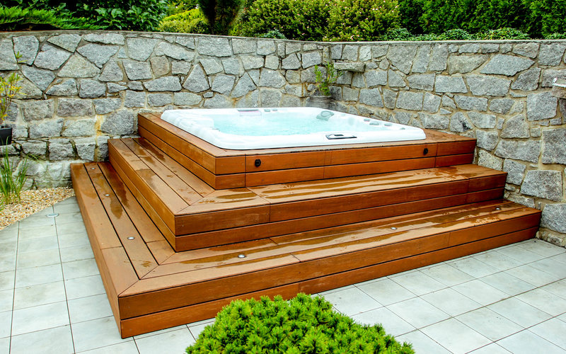 Druhým produktem, který jsme pro našeho zákazníka dodávali, je vířivá vana CAMEO modelové řady 880 SUNDANCE SPAS. Čtvercovou vířivku o rozměrech 226 x 226 x 85 cm jsme umisťovali taktéž na zahradu, ovšem tentokrát v její zadní rohové části, která poskytuje dostatek soukromí. Tento model nabízí 6 různých masážních míst celkem s 54 hydromasážními a 6 vzduchovými tryskami určenými k masáži, jak v sedě, tak leže. Její design je navíc podpořen osvětlenými voliči masáže a nasvíceným vodopádem.